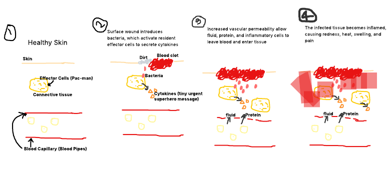 Following here are the events following scratch on the skin. Bacteria invade the underlying connective tissue and stimulate the innate immune response.