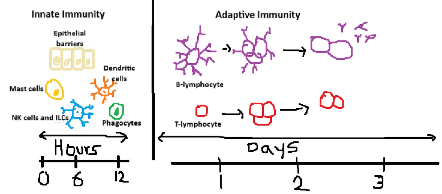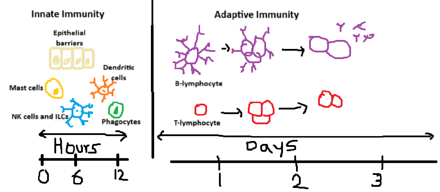 Following is the illustration (still trying harder, adapted from Basic Immunology fifth edition). Just remember that Innate Immunity takes immediate response against microbial invasion, and Adaptive Immunity undergoes training and develops and then kill the supervillains.