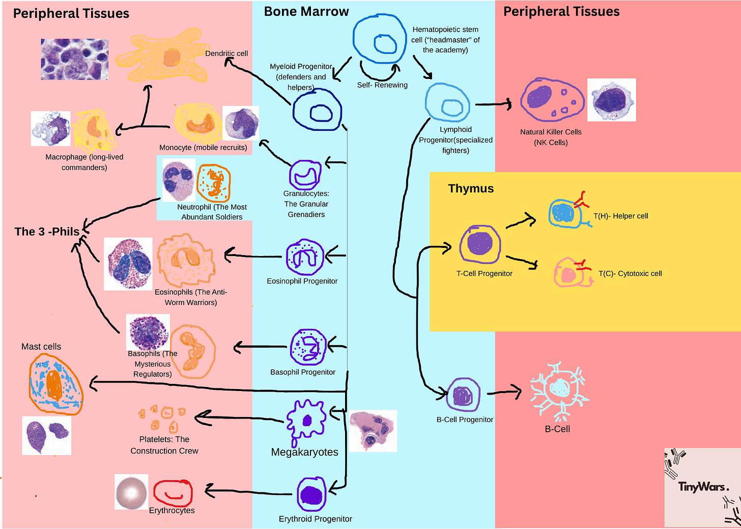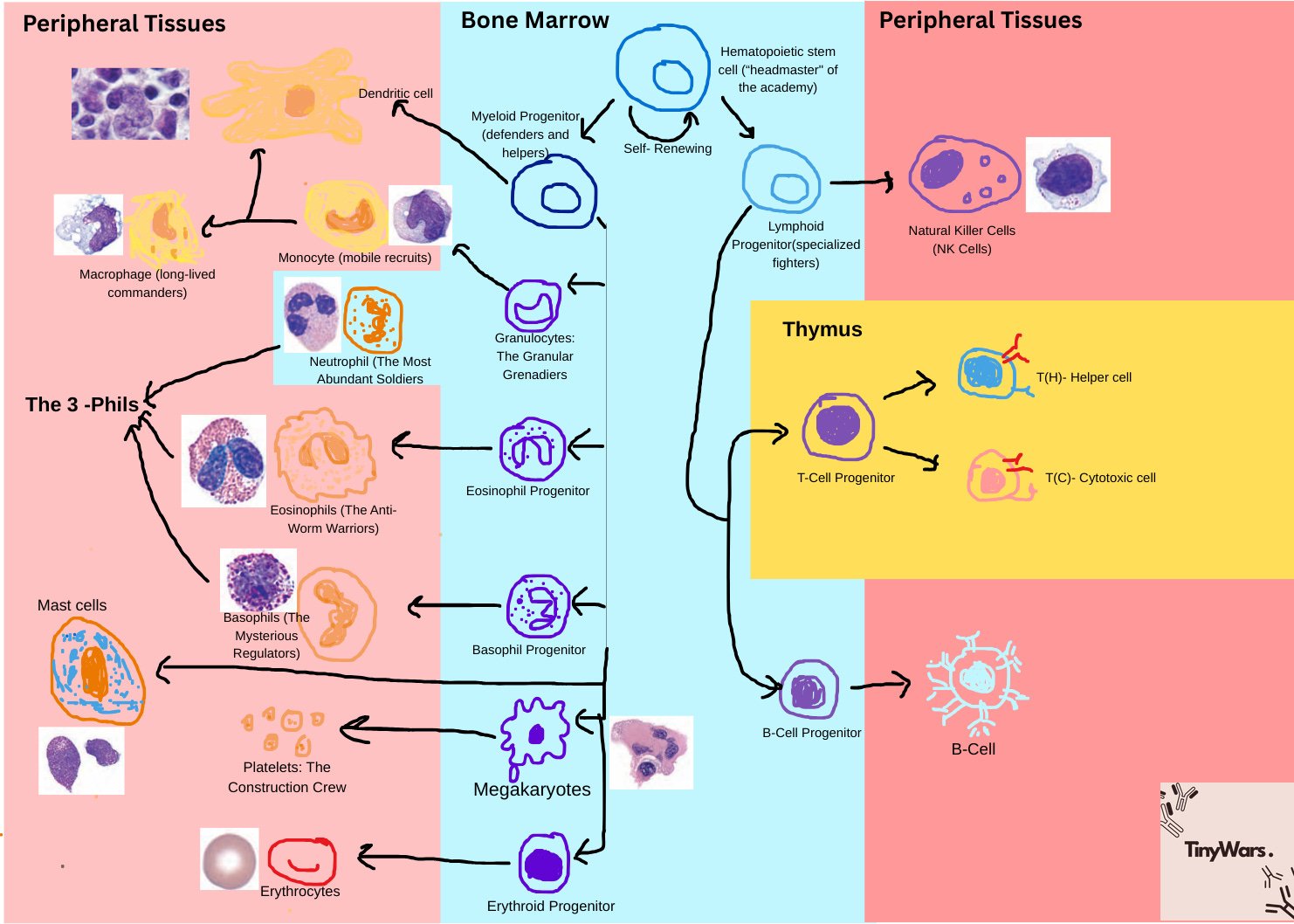 The middle part i.e. in sky blue in colour, Those cells are derived from or present in Bone marrow, for example neutrophile. Other two side which are in red colour sheds are from peripheral tissues. The in orangish yellow, those cells are derived from thymus. And for little too much familiarity purpose, I’ve added different analogy that introduced in previous few posts about lineages.